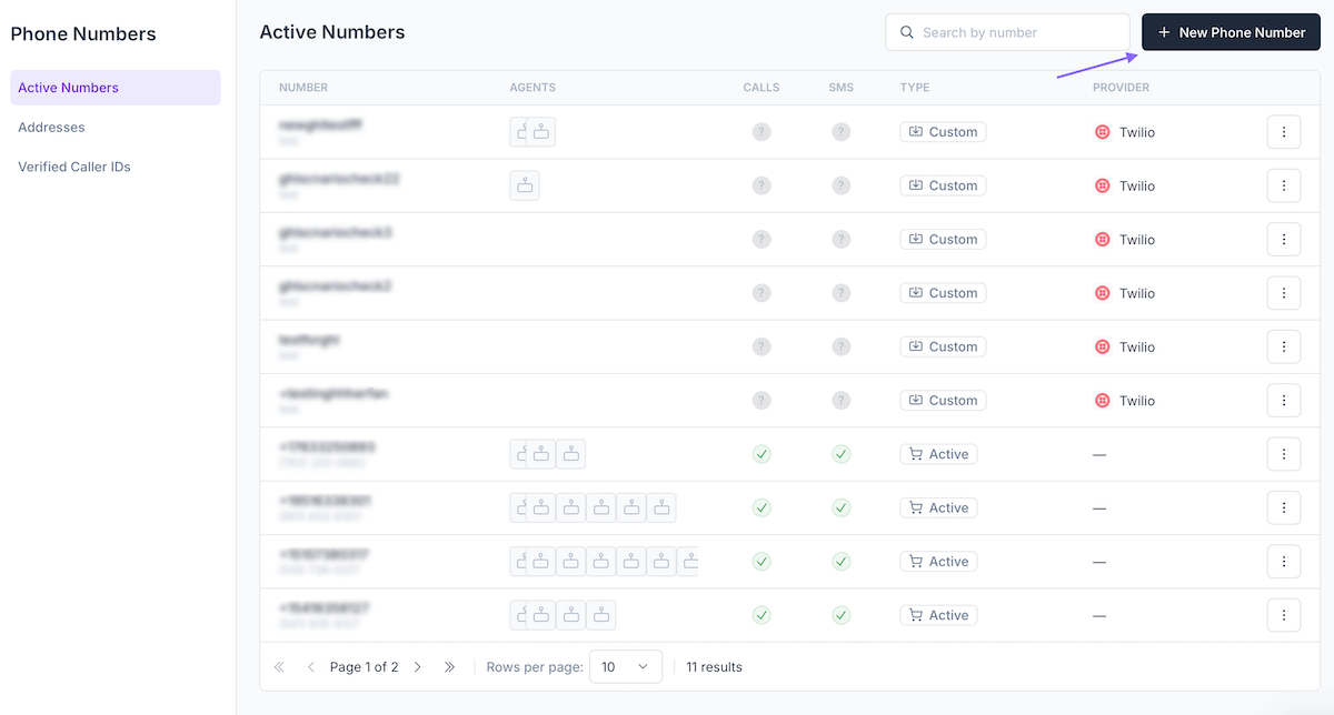 Deploy agentsPhone numbersBuy a phone numberCopy page1Click Phone numbers on the left-hand sidebar. 2Click New phone number > Buy a Number in the top-right corner. 3Choose a number and check the legal compliance box.4Click Continue.5Complete your purchase to add the number to your account.