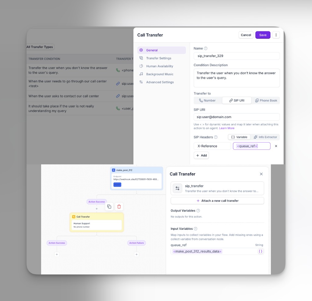 Example: On a SIP transfer action, the SIP Headers section sets header X-Reference to <queue_ref>. That defines one input variable named queue_ref. After the same transfer is added to a flow, the Input variables panel lists queue_ref; here it is mapped to data returned by an earlier action result of a custom action, so the receiving side gets a stable correlation id on the SIP leg without hard-coding it in the action template.