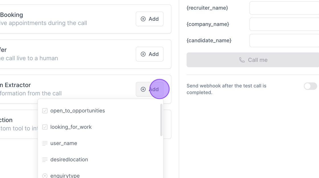 The extracted data is sent along with the webhook after the call.