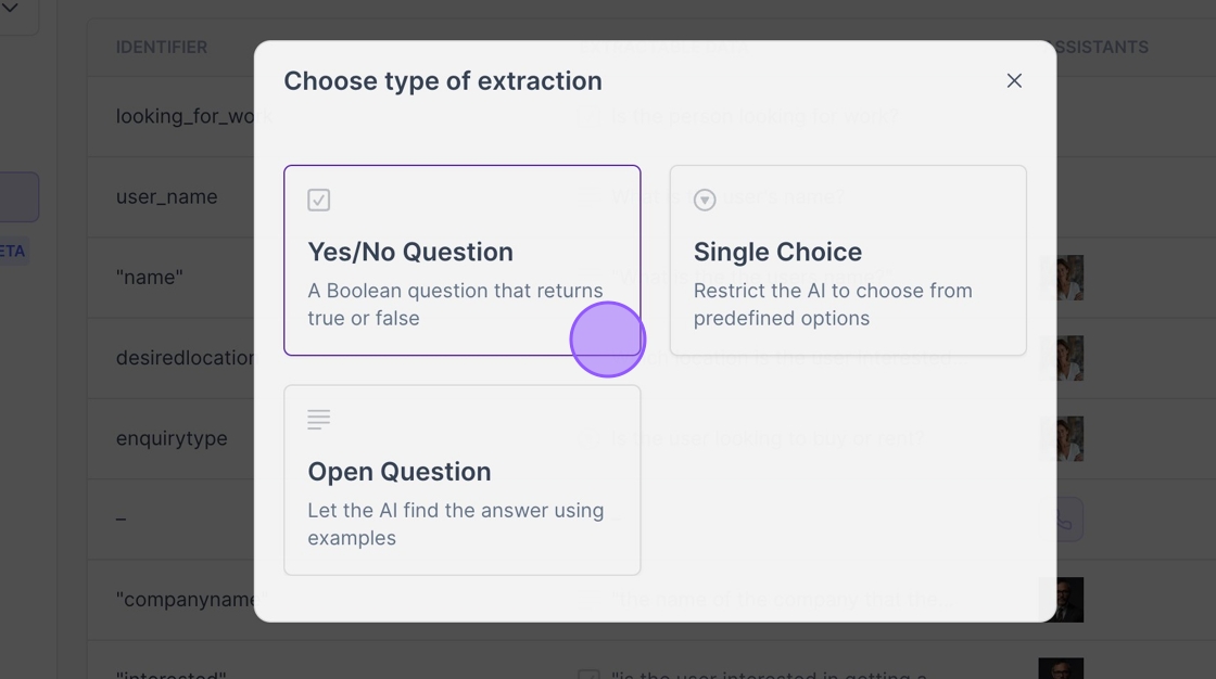 Single Choice Lets you define a list of pre-set options, and the AI will pick the one that fits best.