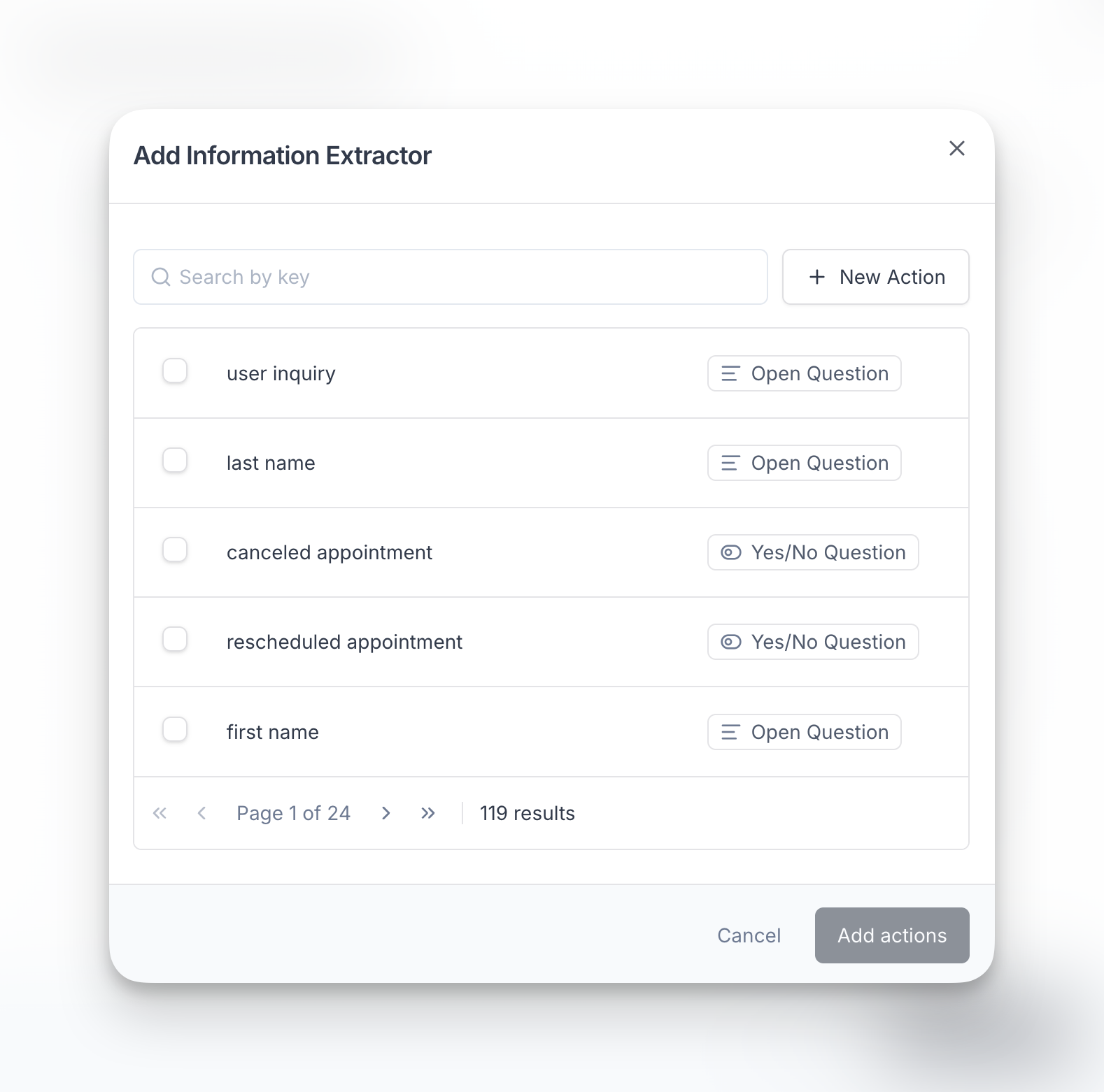 Navigate to the After the Call tab, and select Information Extractor. A window will show up listing all your existing extractors. Select the ones you wish to attach to your agent, or click on New Action to create a new one.