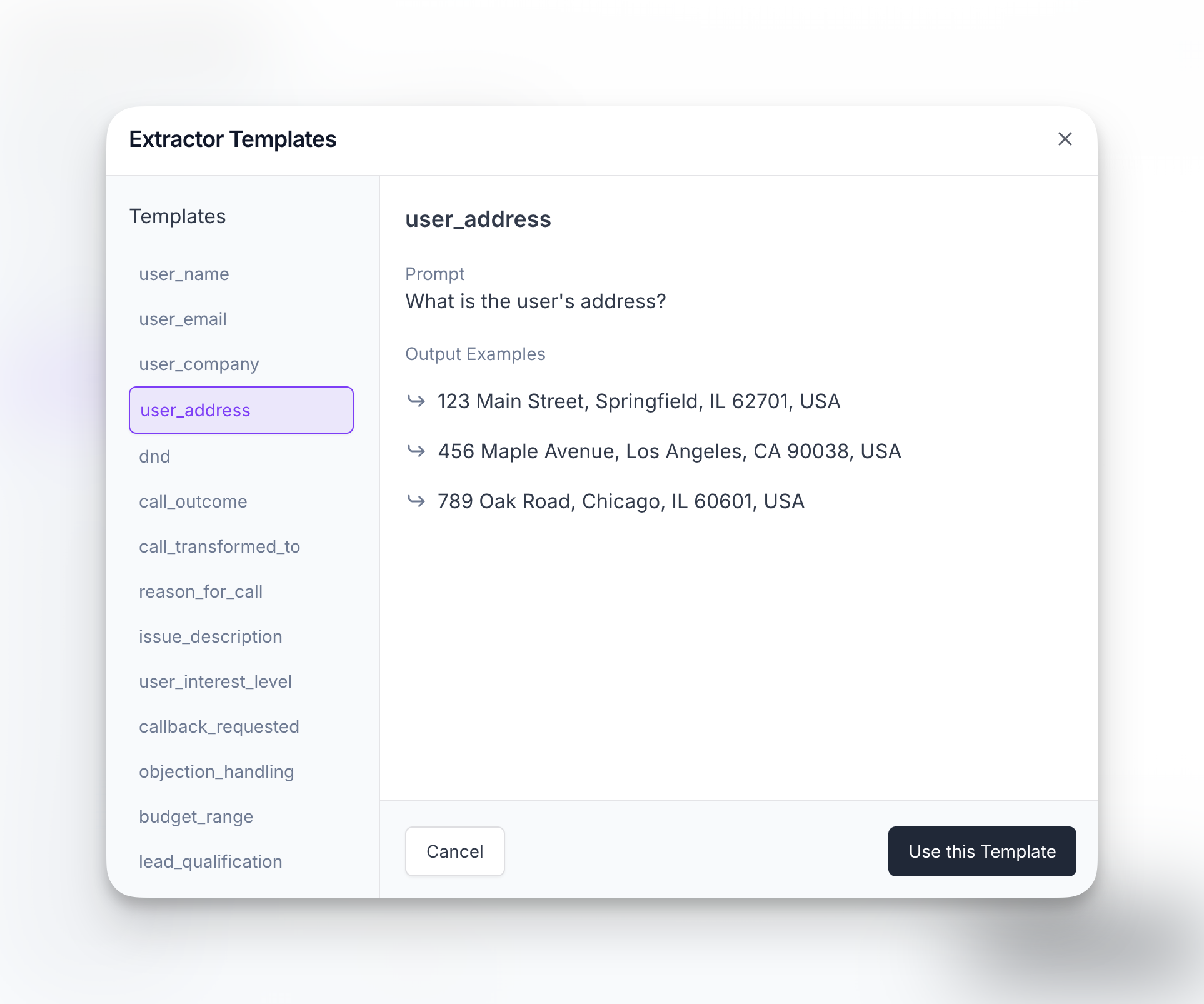 Information Extractors are reusable actions that you create once and attach to any agent. They work in the background during calls to identify and extract specific information based on the rules you define.