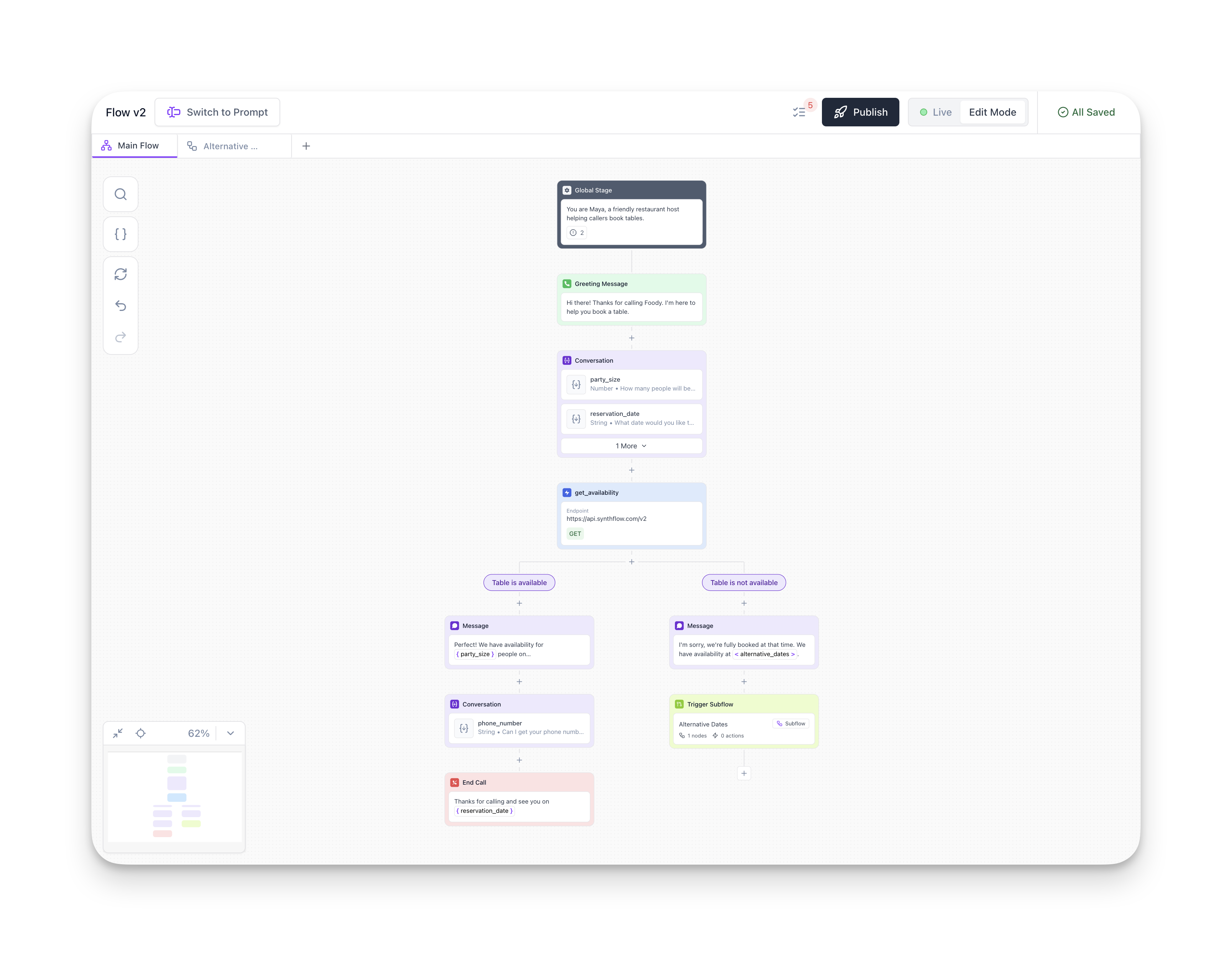 This example demonstrates how different node types work together to create a complete conversation flow. The agent collects information from the user (party size, date, time), checks availability via an API call, handles both success and failure scenarios with branching logic, and confirms the reservation—all while handling potential objections through Global Settings.