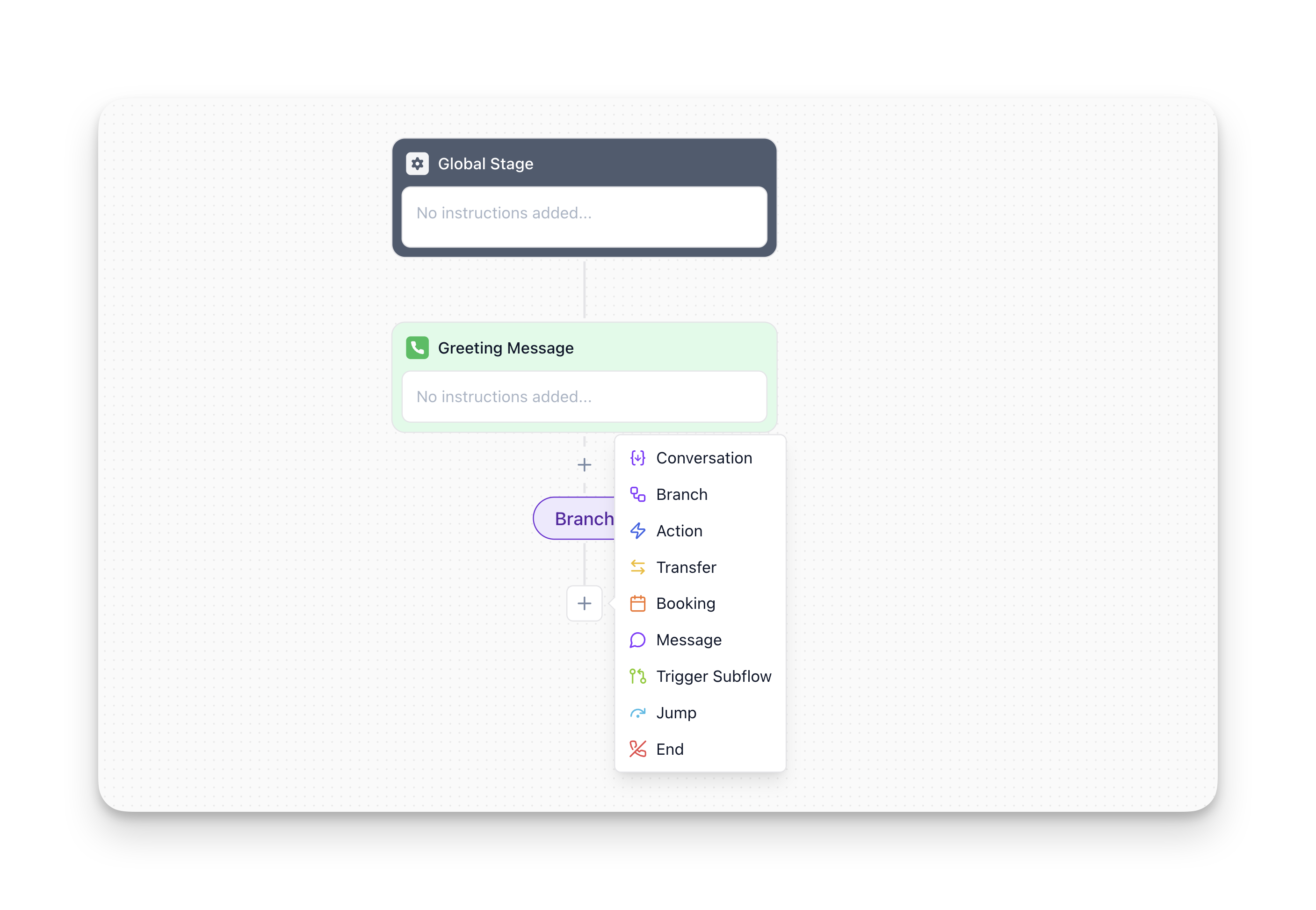 Nodes are the building blocks of your conversation flows. Each node represents a specific action or decision point in your conversation. Here is a summary of all the available node types: