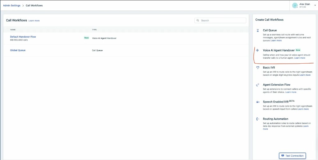 - In the Create Call Workflows panel on the right, select Voice AI Agent Handover.