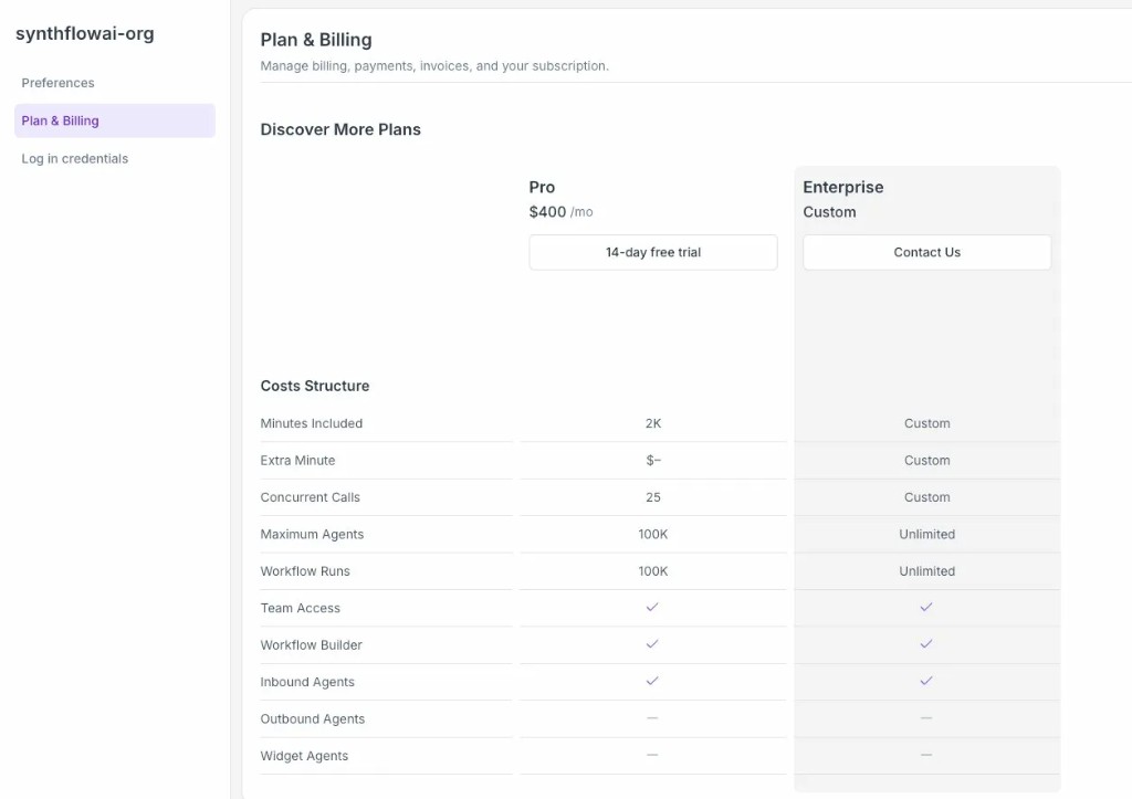 When you first open the Synthflow portal, you’ll be prompted to select a plan.