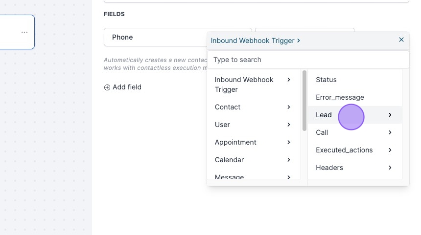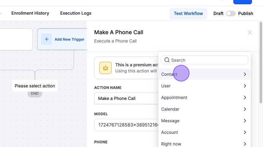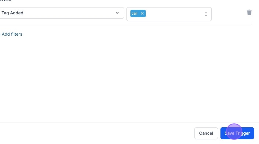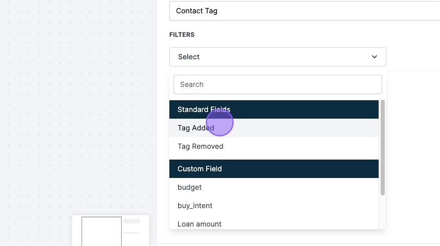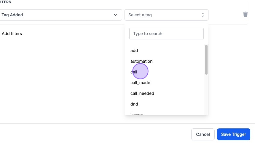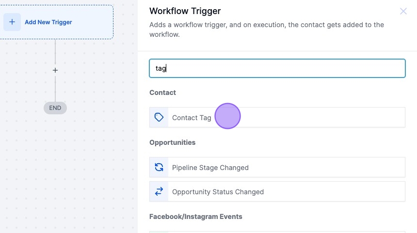 7. Click “Contact Tag” You can use other triggers, such as “Pipeline Stage Changed,” “Opportunity Status Changed,” or “Form completed”. This depends on your use case.
