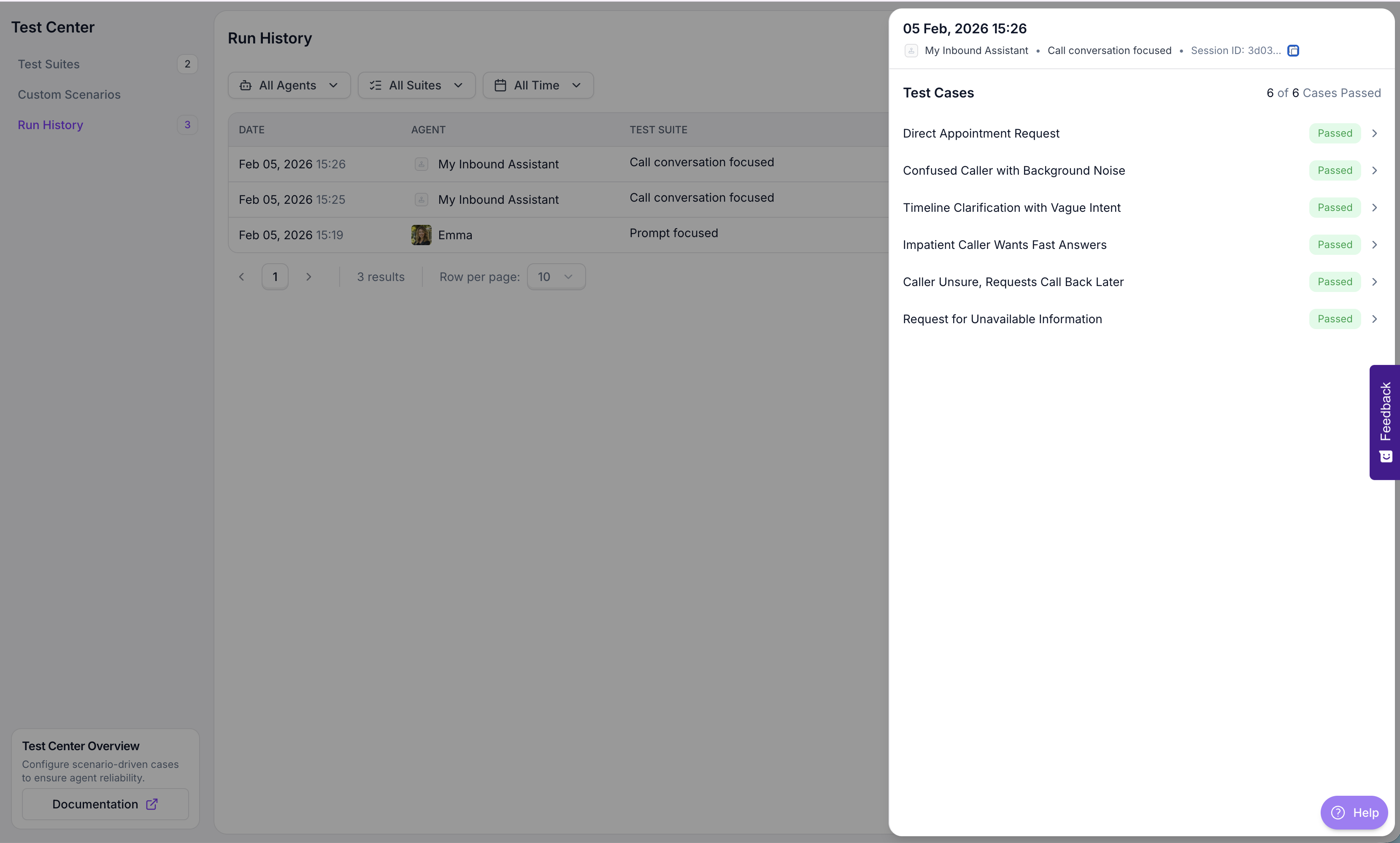 After simulations finish, open the Run History tab to see all sessions. Each row shows the date, agent tested, test suite name, and overall status. Click any session to see the individual test case results.