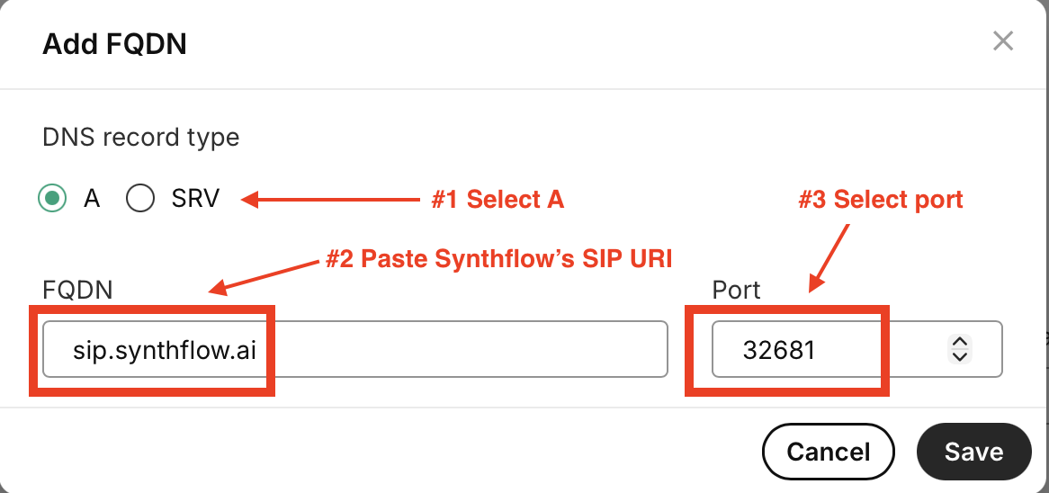 Step #2: Add FQDN & Add the FQDN of Synthflow’s SIP server: