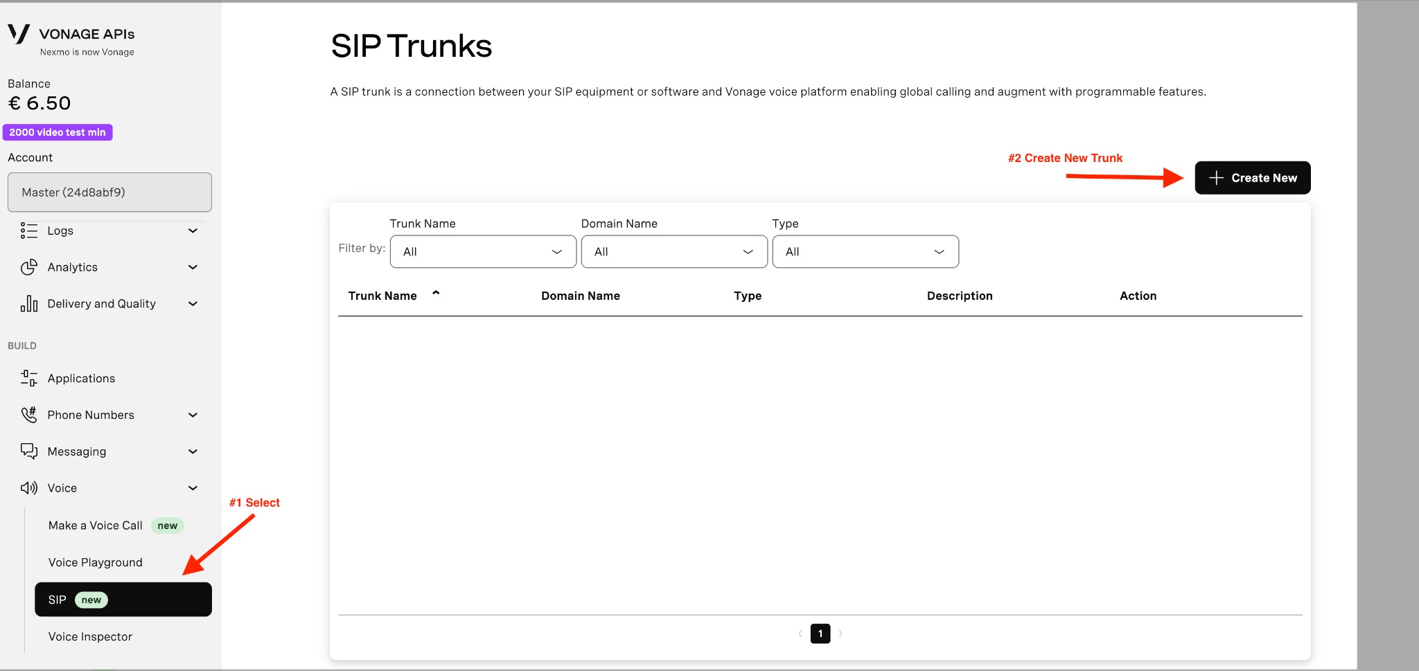 Navigate to the Voice section in the Vonage APIs dashboard, then select SIP from the menu. Click the ”+ Create New” button to create a new SIP trunk.