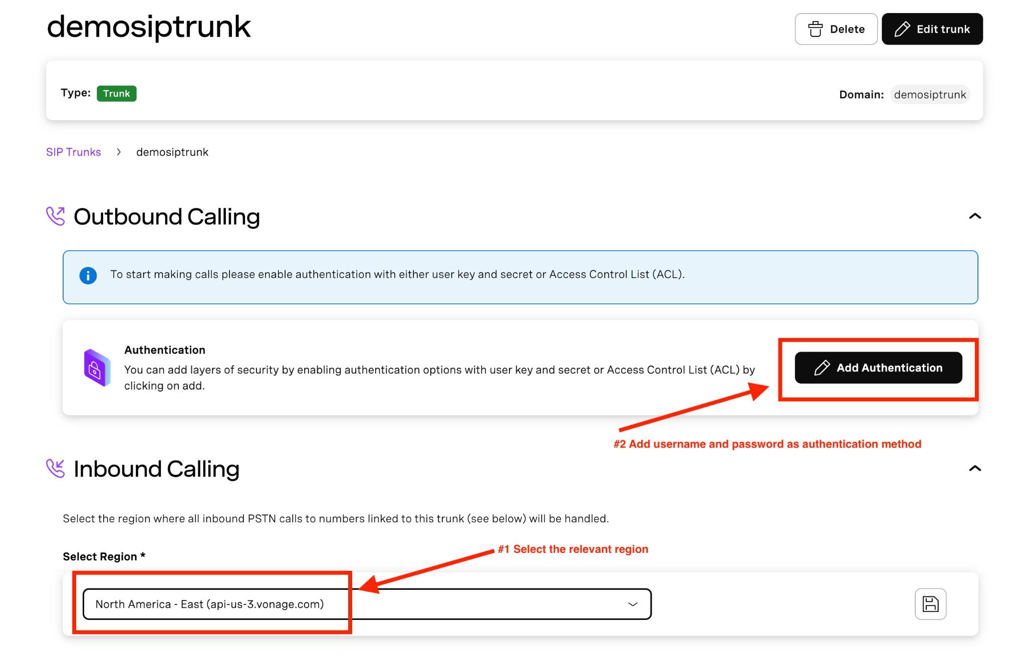 yourdomain.sip-us.vonage.comfor US region) - #4 Add username and password – Enter the User Key and Secret you configured in Step #3