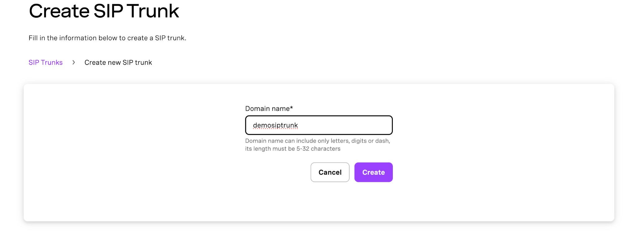 Fill in the information to create a SIP trunk. Enter a domain name for your trunk. The domain name can include only letters, digits or dash, and its length must be 5-32 characters.