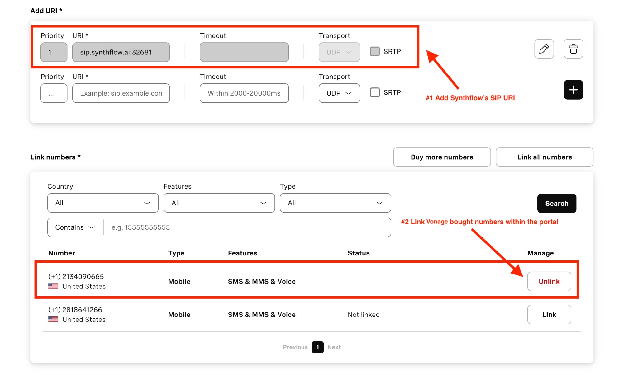 Step #5: Add Synthflow’s SIP URI and Link Numbers