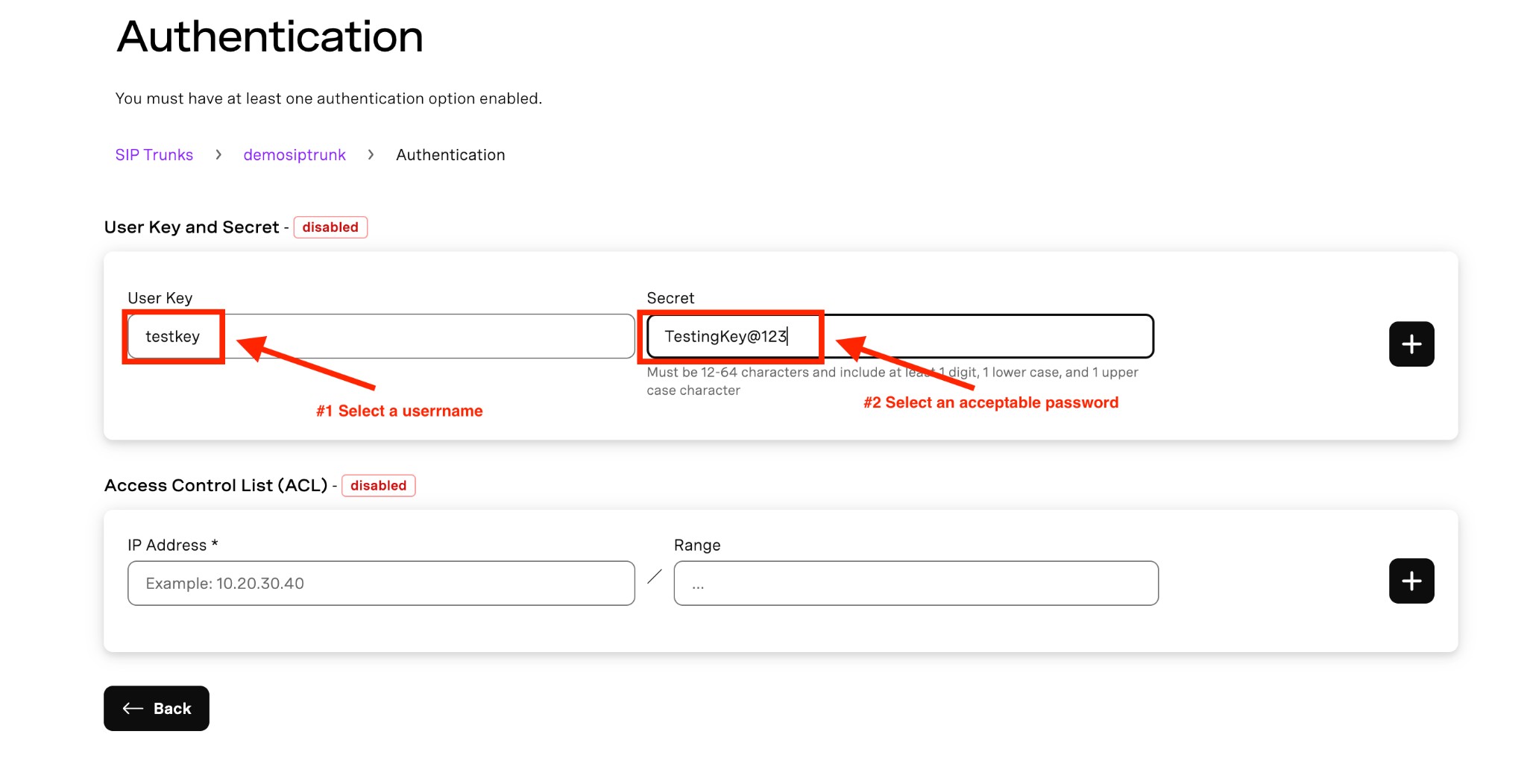 Navigate to the Authentication section of your SIP trunk. You can add authentication using User Key and Secret or Access Control List (ACL). You must have at least one authentication option enabled.