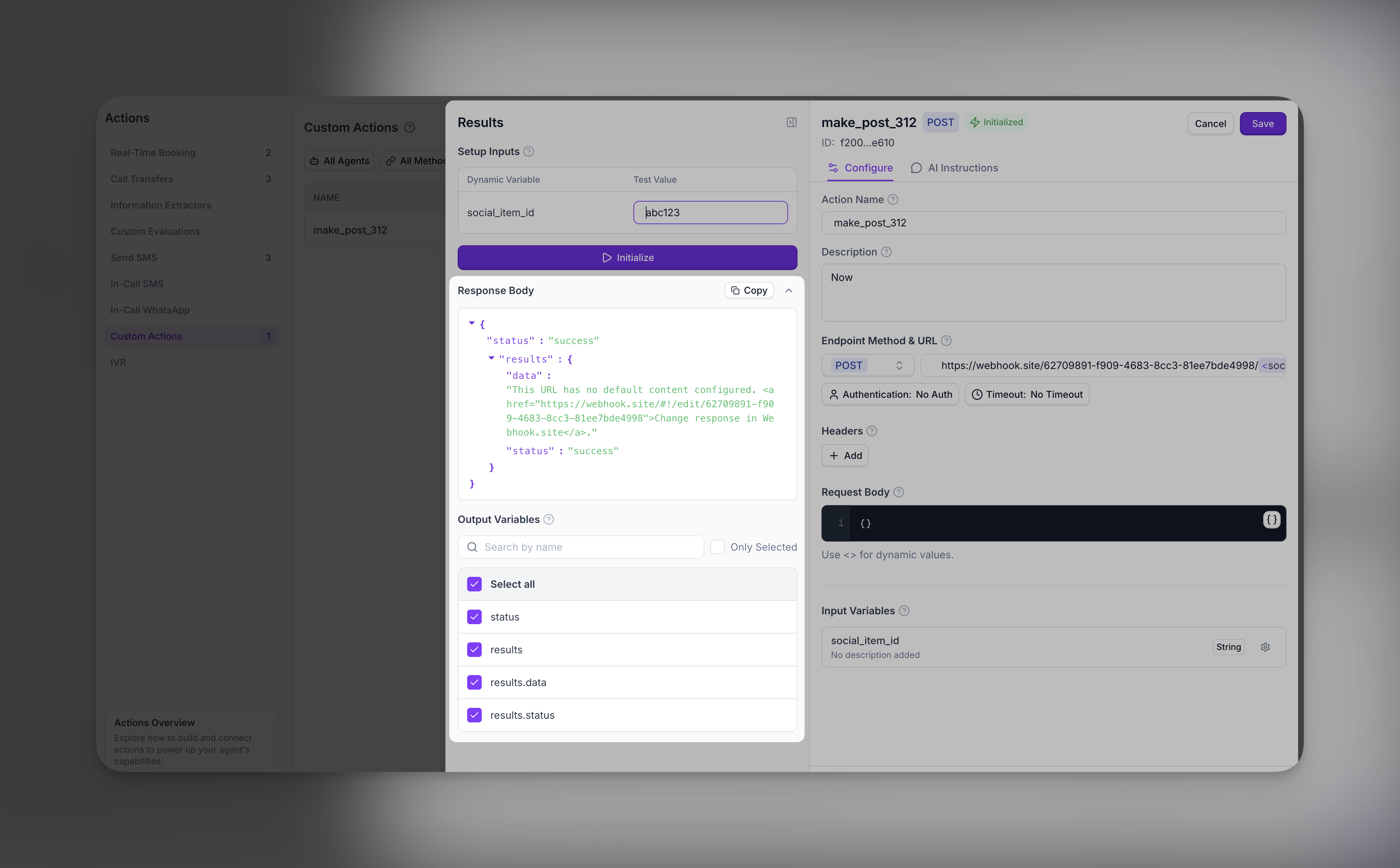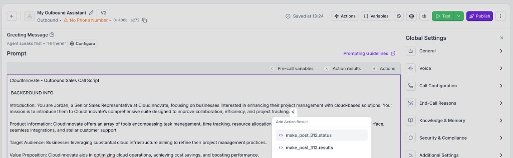 "Hi {lead_name}, thanks for calling {company_name}.". - Custom Actions: Pass variables in API parameters or body fields on Custom Actions, shape JSON with placeholders, and reuse response fields in later steps.